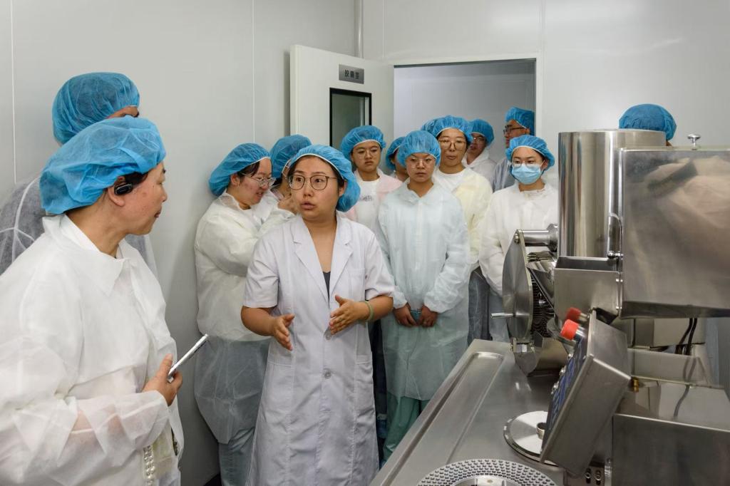 GMP(Good Manufacturing Practice)药厂车间是现代药厂必要场所,药厂生产厂区通常分为一般生产区(无洁净要求)、控制区(100000级、300000级)、洁净区(10000级)和无菌区(100级)。药品是用来治病救人的,为保证药品的质量和安全,GMP规定,制剂生产、原料精烘袋、制剂使用的原辅材料、与药品直接接触的包装材料等,均应在洁净区内进行。因此,所谓洁净车间,首先要基本消除车间内的有害气体、细菌、微生物、颗粒污染物等,其次,车间内的温度、压力、噪音、光照等环境因素(指标)也应在合理范围内。参观过程中,刘艳梅院长耐心为同学们讲解现代医药生产研究操作合规的重要性,大家更换无尘衣装进行参观,受益良多。