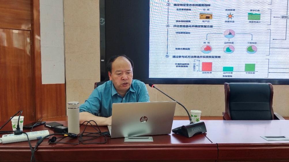 周华坤研究员围绕 “三江源区高寒草地退化现状”、“引起高寒草地退化的原因”、“高寒退化草地修复新技术”和“高寒退化草地修复评价体系”四个方面系统阐释了其研究团队关于退化高寒草地修复治理的理论和实践研究体系。周华坤研究员的报告内容丰富翔实,逻辑清晰严谨,既有理论高度,又有实践深度,运用了大量长期野外观测数据和典型实践工作案例分析,生动展示了草地生态系统修复治理和适应性管理研究工作的魅力和价值。报告极大地启发了师生们的研究思路和激发他们的科研热情。