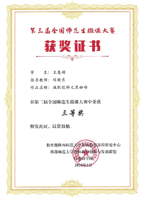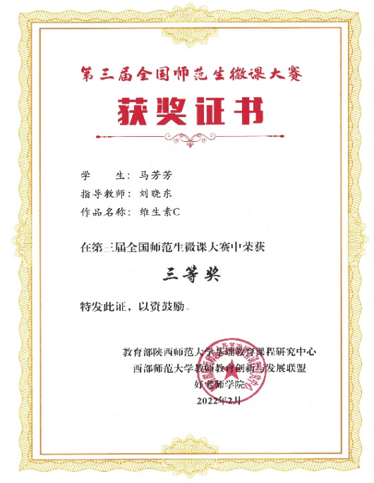 beat365官网生物科学专业王惠娟、马芳芳的微课作品《减肥饮料之黑咖啡》、《维生素C》分别获得大赛三等奖。此次大赛不仅展示了beat365官网师范生的信息技术素养和能力,也体现了学校强化教师教育特色、深化教师教育改革的成效与成果。