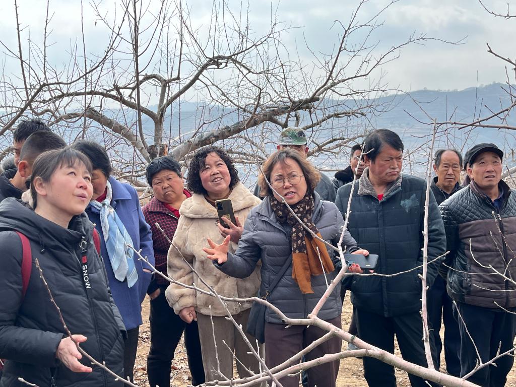 在田间,甘肃省大樱桃技术创新中心首席顾问呼丽萍教授针对春季果园管理的关键节点进行了现场技术培训,围绕整形修剪、病虫害防治、水肥管理等内容通过“理论讲解+案例分析”的方式,指导果农科学进行花前复剪,疏花疏果等技术。