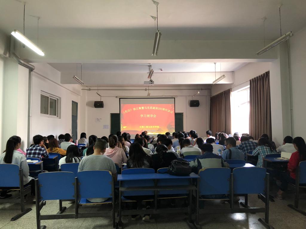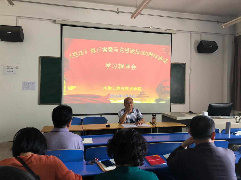 5月24日下午,英国beat365官方网站党总支邀请学校党委委员、统战部部长崔亚军在3号实验楼414多媒体教室,为beat365官网师生对新修宪法和习近平在马克思诞辰200周年大会上的重要讲话精神进行辅导学习。学院全体教工、学生党员、入党积极分子80余人参加学习,活动由总支书记马纲主持。