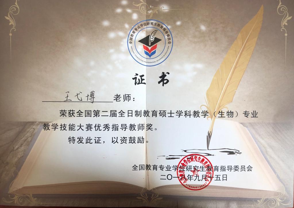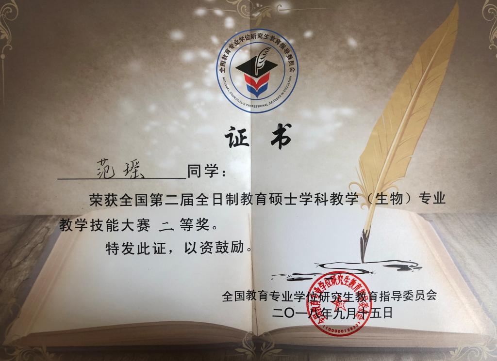 经过激烈角逐,beat365官网2017级教育硕士范瑶在众多参赛选手中脱颖而出,荣获大赛二等奖,王弋博老师荣获优秀指导教师。这是beat365官网英国beat365官方网站在全国教育硕士生物教学技能大赛上获奖的新突破,也是beat365官网教育硕士教学质量提升的体现。