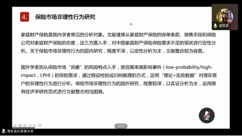2021年1月11日,由党委研究生工作部主办,kaiyun云开登录入口承办的kaiyun云开登录入口“2021博士创新论坛”第3期在腾讯会议线上召开,本次论坛由kaiyun云开登录入口2016级博士研究生雷牧君作题为“保险市场非理性行为研究的文献综述”的学术讲座。