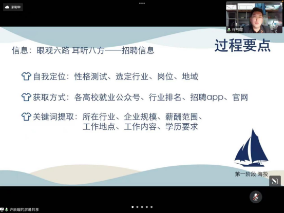 即将入职华为公司的许辰曜学长主要分享关于就业的心理建设、个人经历、以及面试准备的一些小tips,建议选择就业的同学们做好心理建设,不要让焦虑和自我怀疑成为拿到更好的offer的阻碍。他强调就业不是迫不得已下的选择,也不存在所谓的鄙视链,只要选认清自己、选择合适自己的道路就可以。在他看来,根据自己的情况和性格特点选择合适的企业岗位是至关重要的,也要尝试通过多个途径获取尽可能多的招聘信息。