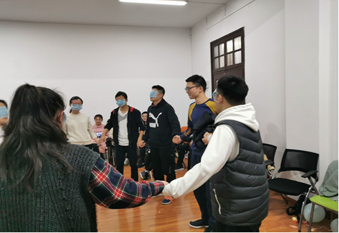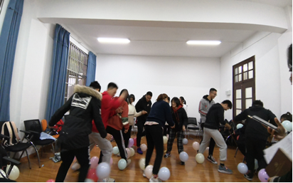 此次活动分为三个部分,暖身部分、合作部分及才艺展示部分。活动开始前,庄老师讲解了本次活动的主要目的与主要流程。在活动暖身阶段,为了帮助大家尽快熟悉各班班委与年级组成员,通过“晕头转向”这一游戏轮流介绍自己,大家互相熟悉了对方的名字、职位和性格。经过了暖身阶段的预热,同学们都放松下来,全身心投入到在小组合作阶段的 “气球引爆战”、“无声传意”和“盲人方阵”等游戏中,通过肢体语言的沟通建立心灵的桥梁。