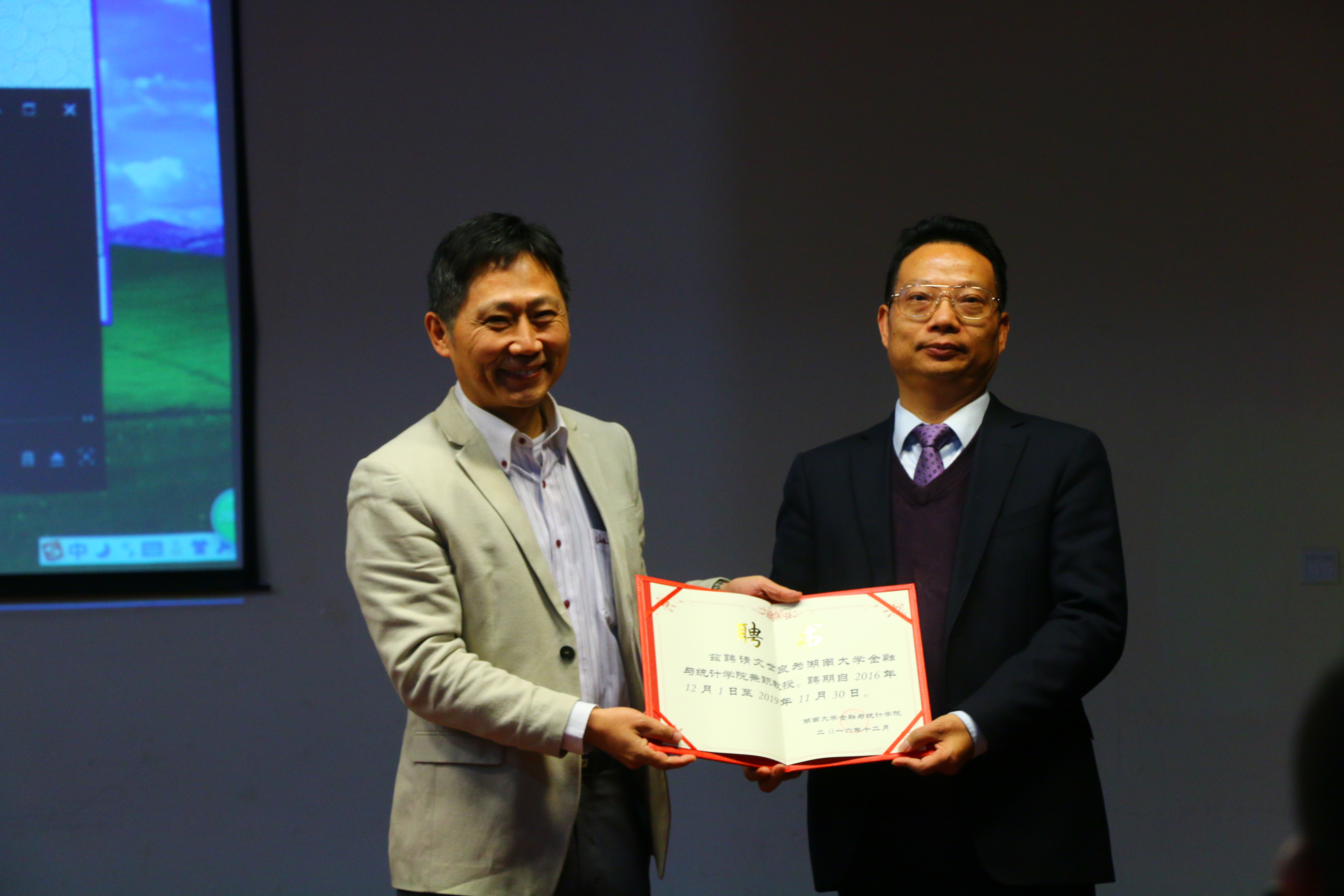 在郑重庄严的伴奏中,金统院院长沈中华教授宣读聘任贺志力、文世良校友为金融学科教授并颁发聘书。教务处彭秋平副处长为两位校友佩戴校徽,张强理事长与贺志力校友签订捐赠协议,杨副校长向贺志力校友及深圳校友会颁发捐赠证书。