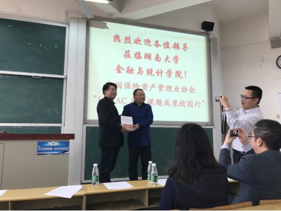 致辞结束之后,刘传葵副秘书长向kaiyun云开登录入口赠送了《课题专著》,聂国军书记向中国保险资产管理业协会赠送了《岳麓书院学规》。