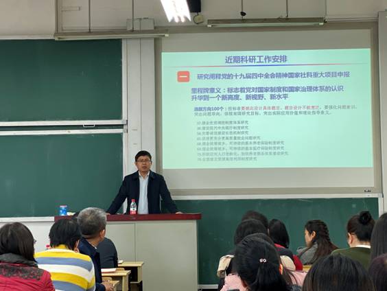 接下来,王修华副院长就近期的科研工作安排展开部署,对“研究阐释党的十九届四中全会精神国家社科重大项目”展开动员, 指出本次会议标志着党对国家制度和国家治理体系的认识升华到一个新高度、新视野、新水平,具有里程碑意义,要求老师们高度重视本次会议精神,基于前期的研究基础,以现实问题为导向,选择相关的研究领域积极开展研究。同时学院已全面展开申报意愿摸底调查,点对点通知每一位老师,为老师在文件解读、组建团队、平台交流等方面提供精准服务。再次强调了国家课题申报的时间,要求老师们注意把握时间节点,与学校、学院合拍共振。