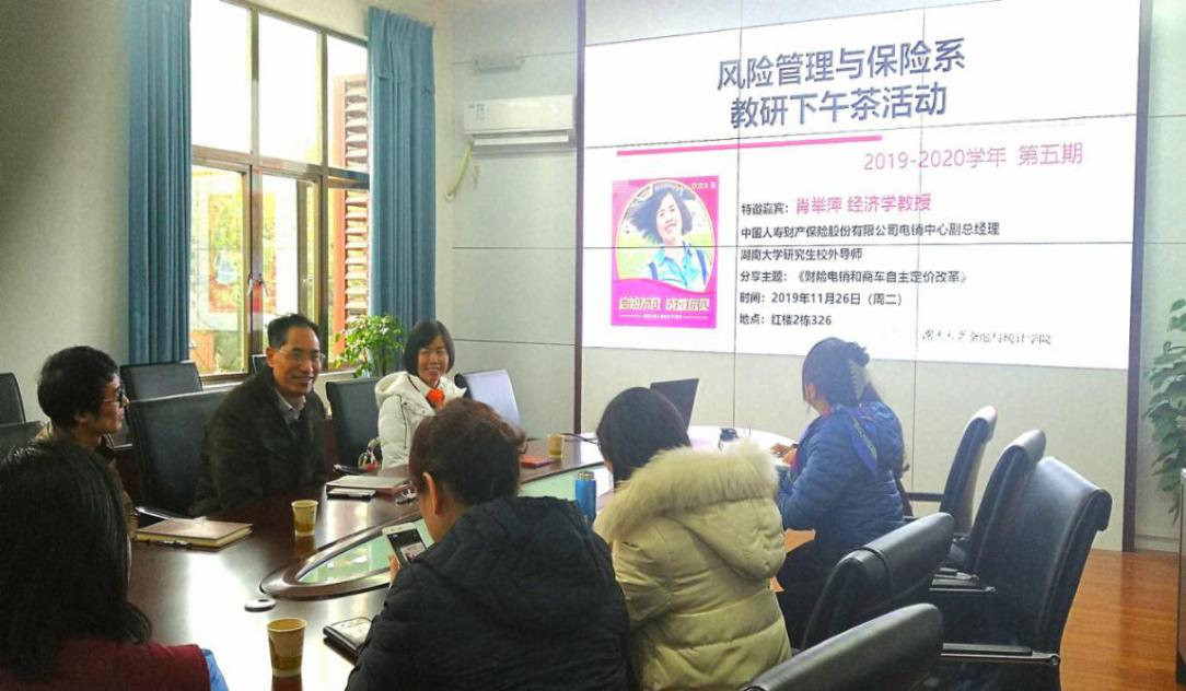 2019年11月26日下午,kaiyun云开登录入口风险管理与保险系教研下午茶活动2019-2020学年第五期,在kaiyun云开登录入口财院校区红楼2栋326举行。本次活动特别邀请了中国人寿财产保险股份有限公司电销中心副总经理、经济学教授肖举萍,kaiyun云开登录入口陈迪红副院长为肖举萍同志颁发了kaiyun云开登录入口研究生校外指导老师证书,随后肖教授给大家分享了《财险电销和商车自主定价改革》的学术讲座。本次活动由kaiyun云开登录入口副院长陈迪红主持,风险管理与保险系主任张宁以及保险系全体教师和部分研究生参加了此次活动。