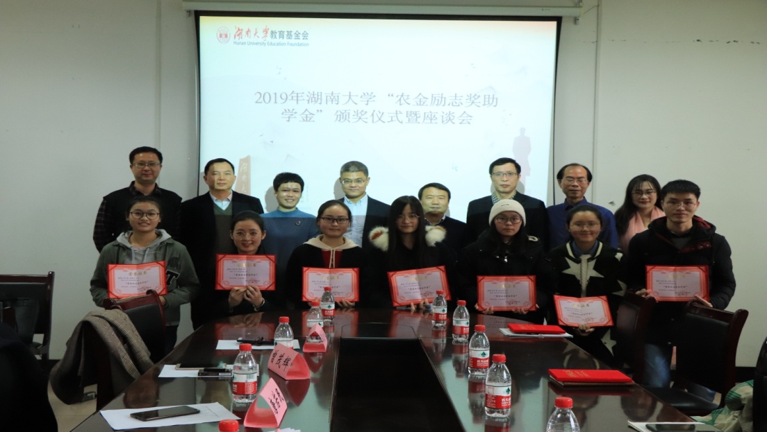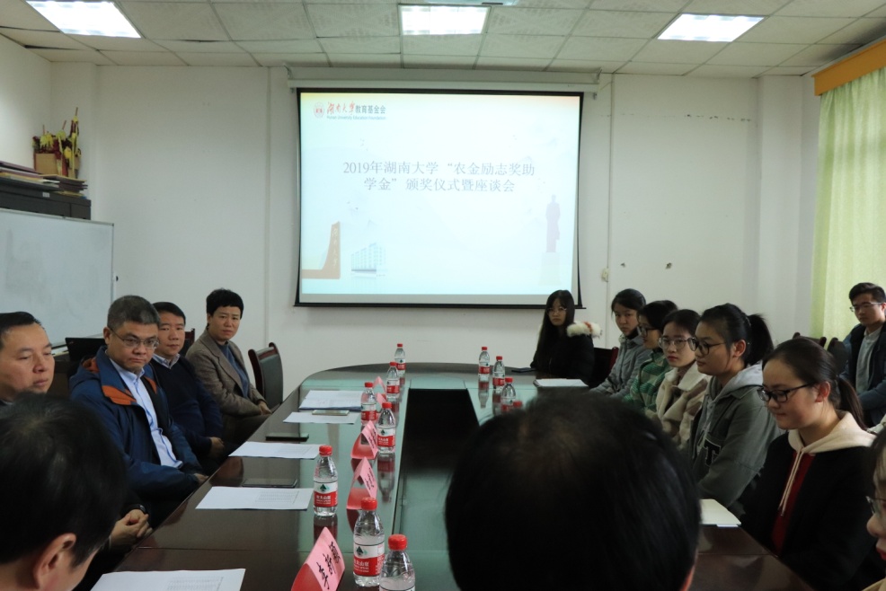 11月30日上午,2019年kaiyun云开登录入口“农金励志奖助学金”颁奖仪式暨座谈会在kaiyun云开登录入口财经校区行政楼707会议室顺利召开。kaiyun云开登录入口原党委副书记刘周平老师,kaiyun云开登录入口校友办主任张学陶老师,kaiyun云开登录入口教育基金会刘垠杉老师 ,原湖南财经学院金融系农金931班校友唐若民先生、李新颖先生、申建国先生、曹茂辉先生、谭授仪女士五位校友代表出席了本次座谈会。此外,与会成员还有2019年“农金励志奖助学金”获奖学生代表10余人。