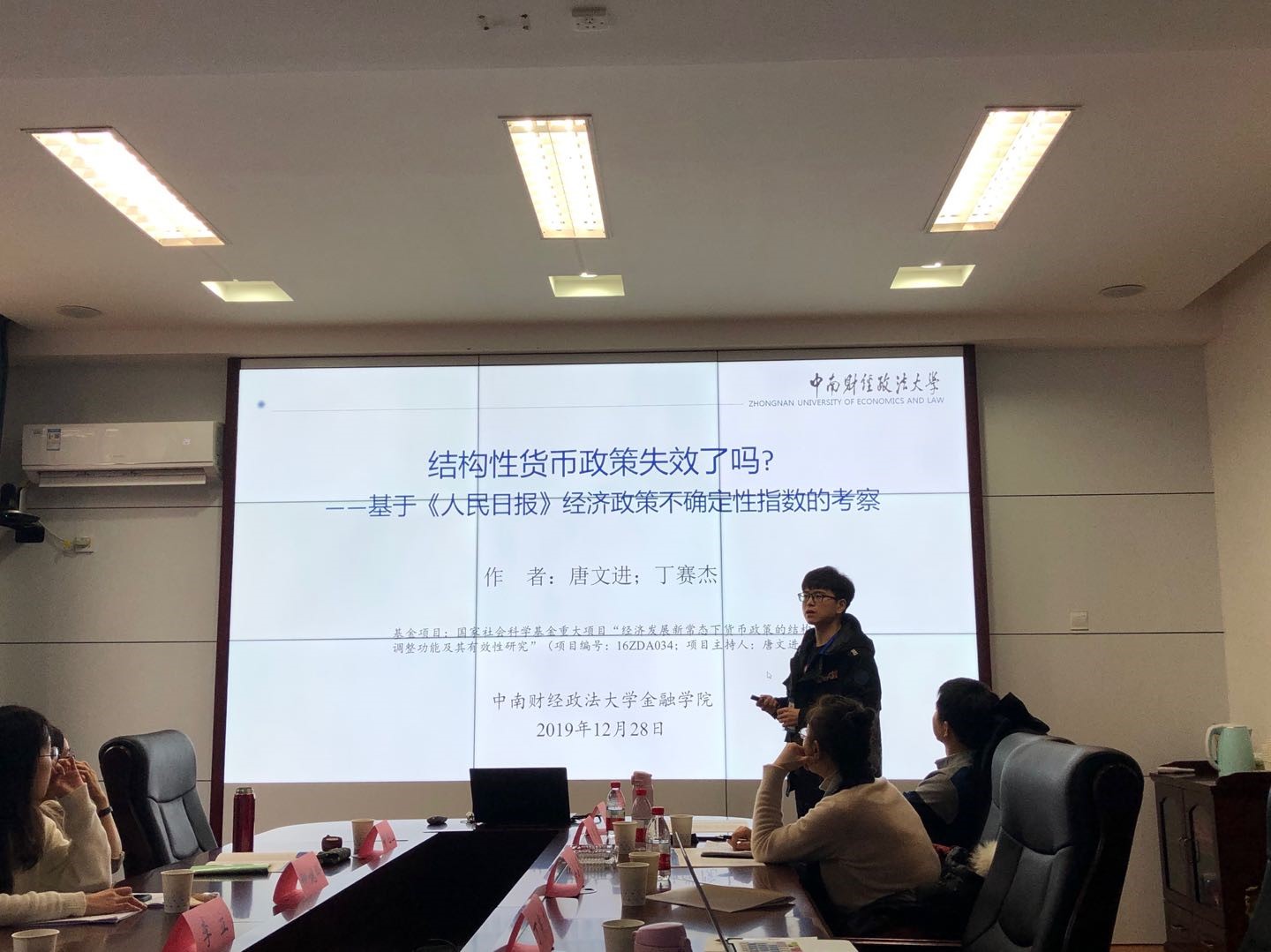 中南财经政法大学丁赛杰硕士报告的题目是《结构性货币政策失效了吗?--基于〈人民日报〉经济政策不确定性指数的考察》,文章对结构性货币政策进行探究,并得出保持经济政策的稳定性、增强市场信心是结构性货币政策充分发挥作用的重要前提。随后,kaiyun云开登录入口教授喻旭兰老师对文章进行点评,并提出了建设性的意见。