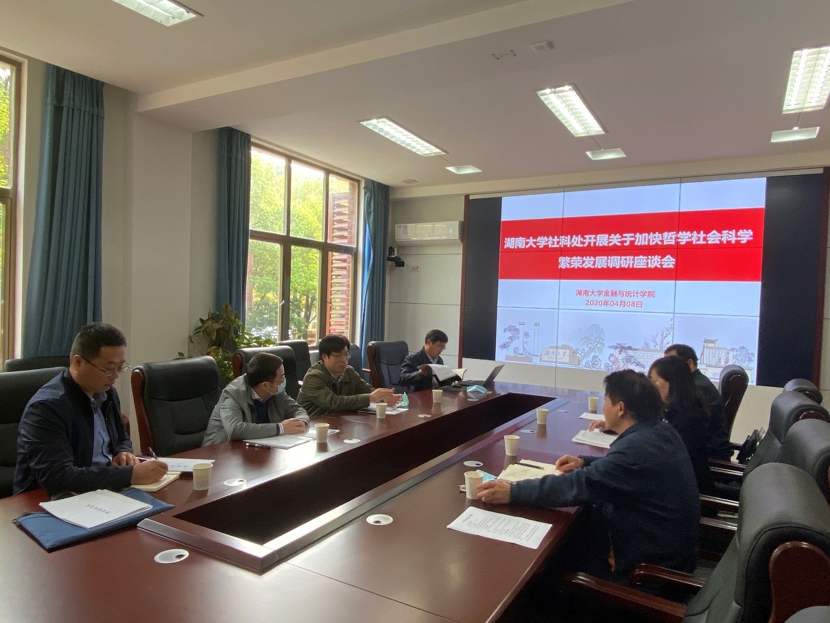 2020年4月8号下午,kaiyun云开登录入口副校长谢赤、社科处处长侯俊军、副处长李恩军、社科处鲁丽梅老师、周文杰老师等一行来学院就关于加快哲学社会科学繁荣发展主题开展调研。学院党委书记聂国军、副院长王修华、科研秘书吕亚妮出席座谈会。