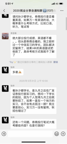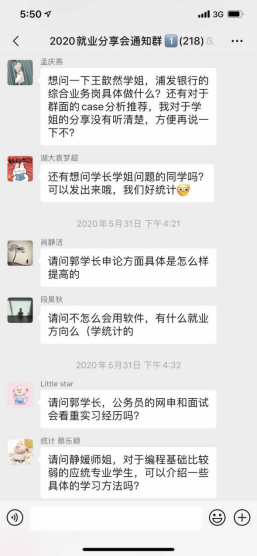 本次活动不仅有来自各行各业的校友、应届毕业生干货满满的经验分享,也给参加活动的同学们提供了与他们沟通的机会。参会同学们通过微信群聊天的方式,向他们提出了自己想问的问题,在经过我们工作人员的收集筛选之后,他们也通过文字的形式对这些问题进行了回答,解开了同学们心中的疑惑。