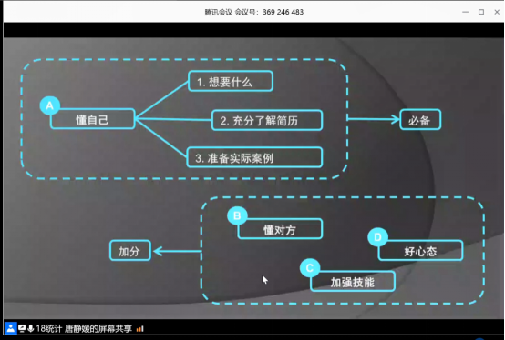 首先进行经验分享的是将要入职华为财经的王歆然同学,她用幽默的语言和结合实际的方法为我们分享了侧重于企业方向尤其是华为公司的一些经验。整个分享主要包括以下几个方面:如何对自己和就业目标有一个清晰的认识、个人的求职经历回顾、简历与面试技巧分享、个人的一些其他建议这几个部分。