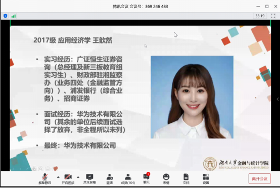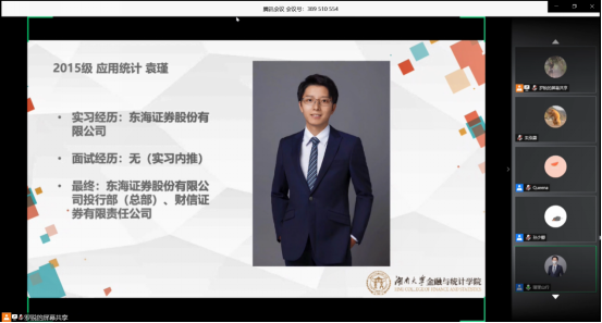 鉴于当前在校部分研究生同学目标不明确,受疫情影响毕业生就业形势不明朗的情况,暑期将至,为帮助同学们 尤其是2021届毕业研究生 更好地利用空闲时间,提升求职技能与职业素质,增强就业竞争力,使同学们明确本专业的就业方向及优劣势,从而合理规划研究生阶段的学习、工作和生活,从根本上有针对性地解决同学们学习和生活目标不明确,就业意识缺乏的问题, kaiyun云开登录入口研究生会 于2020年5月30日举办了毕业生线上就业交流分享会活动。本次活动通过腾讯会议平台举办,邀请到了金统院研究生辅导员苏雅倩老师参加本次分享会,也邀请到了15级毕业于应用统计专业的校友袁瑾、17级应用经济学的孙少卿同学、彭劭志同学、郭娜同学、王歆然同学和18级应用统计的唐静媛同学共6位校友和应届毕业生来给我们进行就业分享,并且有共计400余人次的同学参与了本次就业交流分享会。