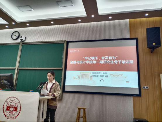 10月23日下午,开班仪式在财院校区二教101举行。学院党委副书记颜李作开班动员,他强调研究生干部要加强理论学习,领会上级文件精神,培养优良工作作风与团结协作精神,妥善处理工作学习的关系,并希望全体研究生骨干把握此次培训机会,奋发有为,练就本领,不断推动kaiyun官网研究生工作再上新的台阶。随后,研究生辅导员周斌作了讲话,要求全体研究生骨干应不忘初心使命、全心全意服务研究生同学,应将新生升学的压力转化为前进的动力,不断探索新的出路,找到适合自己学习生活的方式方法。研究生会骨干周诗岚作为全体培训学员代表进行了发言。开班仪式由学院研究生会主席王雪雯主持。
