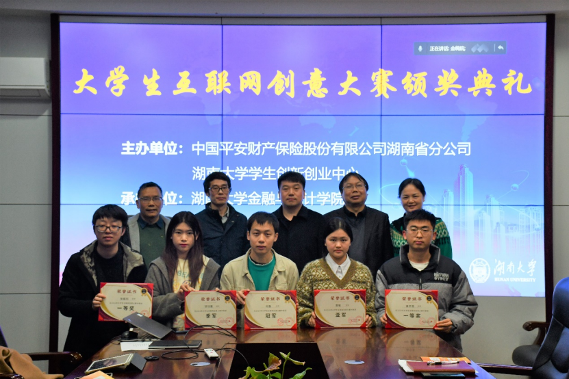 1月13日下午,“大学生互联网创意大赛”颁奖典礼在学院226会议室隆重举行。平安财产保险湖南分公司副总经理李晓,平安创展湖南分公司陈军经理、平安产险湖南分公司车代业务部张彦恒经理、线上客户部张奕经理、个人非车部周巍经理、车商业务四部罗鹏经理、株洲支公司雷文亮经理、线上客户部张燕玲经理以及学院党委书记黄红立、副院长张宁、大赛评委代表汪忠教授、学院学工办主任谢君老师莅临本次颁奖典礼。典礼由保险精算系主任邓庆彪老师主持。