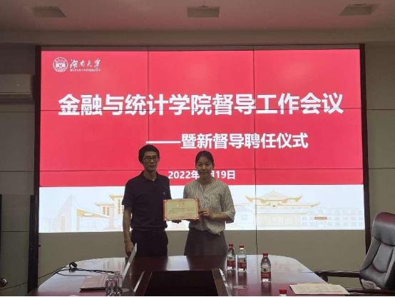 9月19日上午,金融与统计学院召开了2022年秋季学期第一次督导工作会议,并举行了新任督导聘任仪式。会议由张虹主任主持,学院张宁副院长出席,督导中心全体老师参会。