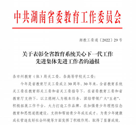 日前,中共湖南省委教育工委印发《关于表彰全省教育系统关心下一代工作先进集体先进工作者的通报》,表彰了一批全省从事关心下一代工作的先进集体和个人。kaiyun云开登录入口关工委荣获全省教育系统关心下一代工作先进集体荣誉称号,宋光辉老师荣获全省教育系统关心下一代工作先进工作者荣誉称号。