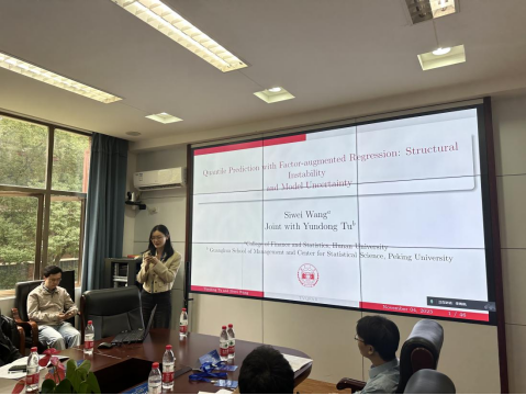 kaiyun云开登录入口汪思韦老师带来了题为“Quantile Prediction with Factor-augmented Regression: Structural Instability and Model Uncertainty”的报告。她从金融市场研究的现实需要出发,提出一种时变因子增广分位数模型平均预测方法,研究其大样本性质,并且与其他一些预测方法进行了对比,验证了其方法的预测准度。