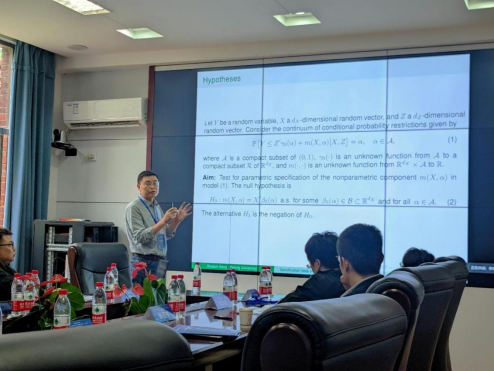 北京大学的宋晓军副教授带来了题为“Unified Specification Tests in Partially Linear Quantile Regression Models”的报告。他针对多分位点的部分线性分位数回归模型设定提出了检验方法,对其的渐近性质等进行了详细的讲解。