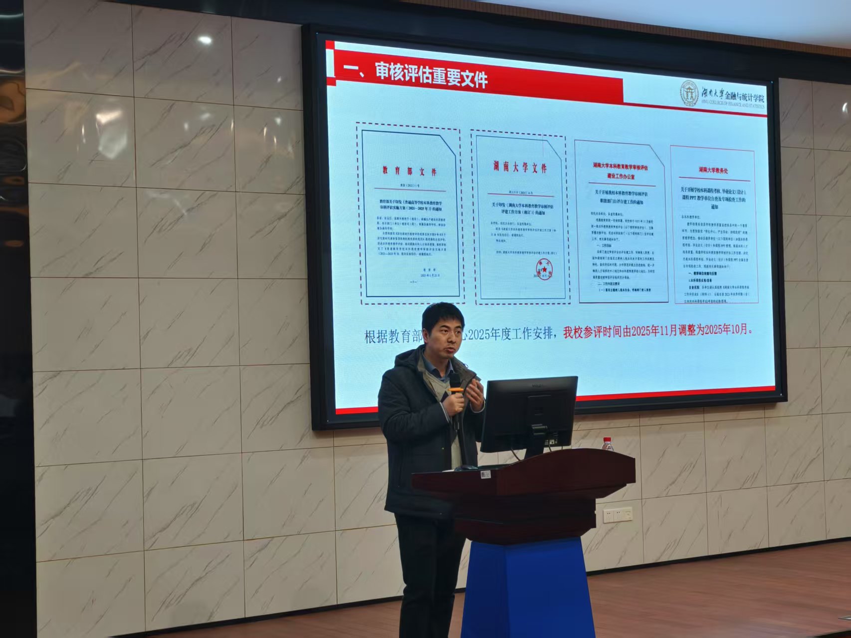 学院院长王修华对本科教育教学审核评估工作进行了部署。王修华指出,全体教职工要深刻认识新时代教育评价改革背景下审核评估工作的新要求、新变化,凝心聚力抓落实,对照时间表、路线图有序推进自评自建工作。王修华强调,要以审核评估为契机,总结和凝练学院本科教育教学工作成绩及特色,积极探索AI时代教育教学质量提升的新举措、新路径,真正实现“以评促建、以评促改、以评促管、以评促强”。