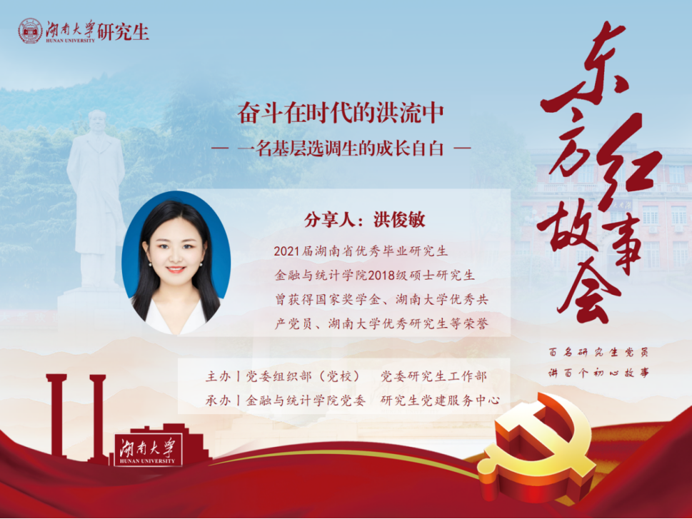 洪俊敏在校期间曾获国家奖学金、kaiyun云开登录入口优秀研究生助理辅导员、kaiyun云开登录入口优秀研究生kaiyun云开登录入口、优秀共产党员、湖南省优秀毕业研究生等荣誉。洪俊敏多次参加研究生课题研究及三下乡社会实践活动,她着重分享了自己前往张家界、邵阳、益阳、怀化等地乡村偏远地区调研的“乡村故事”。她谈到,站在两个百年的历史交汇点,作为一名研究生党员应该起而行之,勇挑重担,将青春书写在社会主义现代化强国建设的进程中。