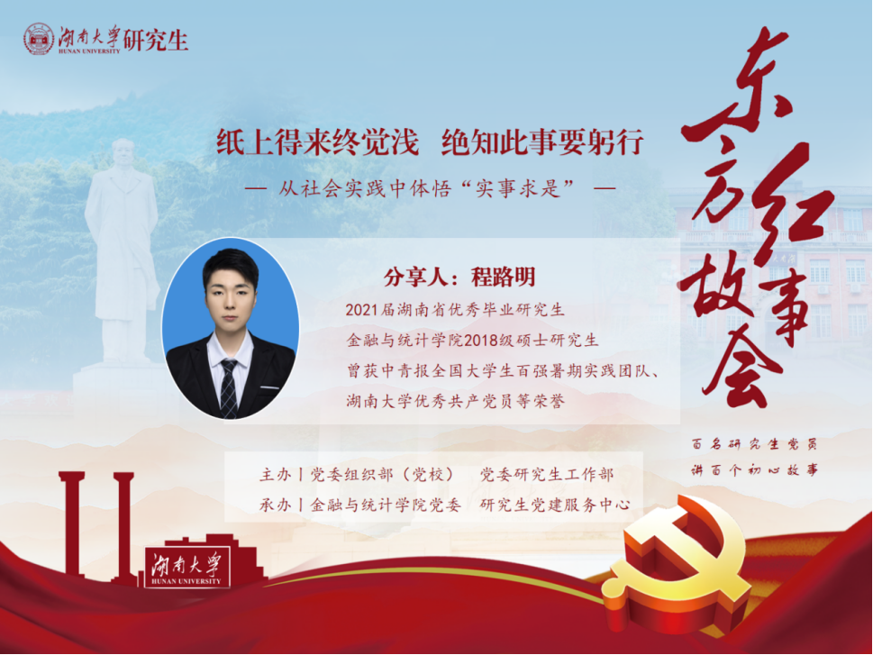 程路明在校期间曾获kaiyun云开登录入口优秀共产党员、kaiyun云开登录入口优秀研究生干部、湖南省优秀毕业研究生等荣誉。2019年,程路明在学院老师带队下奔赴原国家级贫困县永州双牌县进行调研,并开展金融知识普及宣讲。调研期间团队成员克服暴雨、洪涝灾害影响,圆满完成双牌县尚仁里村、九甲村和二甲村等近十个村镇的实地考察工作,并获评中青报全国大学生百强暑期实践团队。程路明鼓励同学们多走出校园参与社会实践活动,躬行致知,体悟“实事求是”的思想内涵。