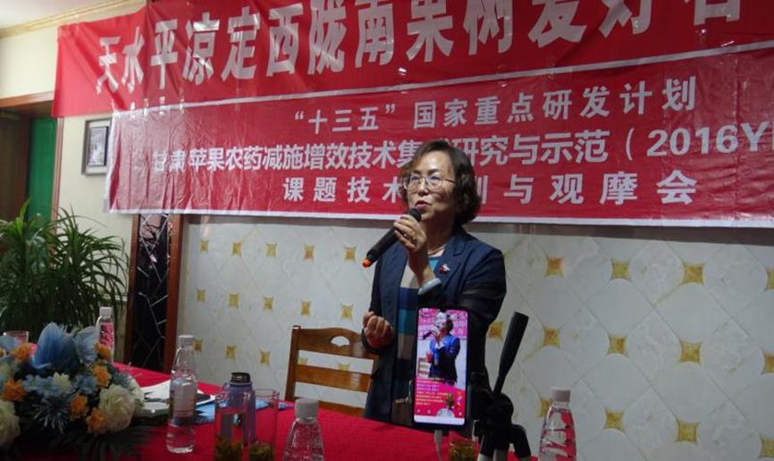培训会上,呼丽萍研究员对苹果栽培管理综合技术、苹果病害发生的原因及特点、病害发生要素、病虫害防治基本原理、病虫害防治技术途径、主要病虫害(白粉病、霉心病、锈病、斑点落叶病、褐斑病、蚜虫、红蜘蛛等)防治方法等方面进行了全面细致的技术培训与指导,针对果树病虫害防治及土肥水管理提出“精准高效用药”及“按需平衡、高效施肥”理念,指出在苹果栽培管理过程中,要注重农药减施增效、有机肥及中微量元素的施用等技术途径的应用,要掌握病害发生时间、发生规律及有效的防治方法,掌握果园土肥水管理注意事项等问题。