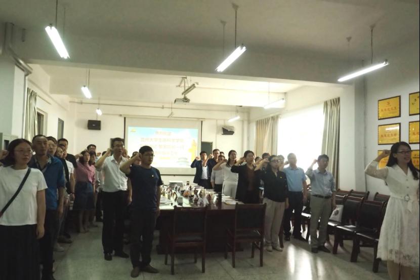 两院党员教师面对鲜红的党旗,庄严地举起右拳,在领誓人的带领下,用铿锵有力的声音向党旗再次宣誓,用铮铮誓言表达自己忠诚于党、奋斗不息的坚定信念。生物学院教工党支部书记石国玺以“党史小故事:南昌起义中的朱德”为题讲微党课,从“朱德入党”、“朱德在南昌起义中的作用”、“朱德为何是中国人民解放军的总司令”、“对我们的启示”等4个层面,缅怀了老一辈无产阶级革命家的丰功伟绩,并号召全体教师不断坚定理想信念,以极大的历史自觉,勇于创造性地开展工作,用自身独特的人格魅力去感染青年一代,帮助他们早日成才。